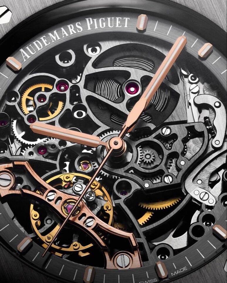 The 15500 Royal Oak at 41mm with alternating brushed-and-polished finishing. The Offshore pushing into 42-44mm chronograph territory. Swiss-grade movement visible through a sapphire caseback, matched to the genuine caliber layout.