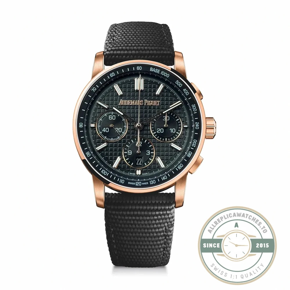 Gold cases demand higher finishing precision because every surface imperfection becomes visible under the reflective material. On the 260483, the octagonal mid-case hidden between the round bezel and caseback shows alternating brushed and polished facets. The black dial serves as a dark backdrop that makes gold hands and hour markers appear to float. The Code 11.59 case geometry gives the black-and-gold combination a distinctly modern framing compared to the angular Royal Oak. For a different material approach to the same design, compare this with the two-tone 26048 in black. Both share the same case architecture within the Code 11.59 lineup, but the materials create two very different watches.
