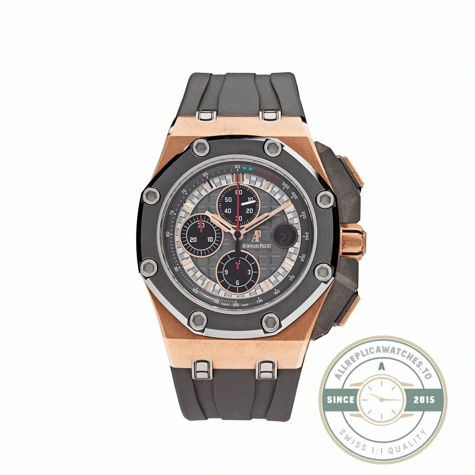 Within the 26568OM reference family, dial color determines the personality. The grey version reviewed here sits between the bolder colorways, offering a neutral base that lets the Mega Tapisserie texture and the mixed-metal case details carry the design. It avoids the high contrast of a black dial and the fashion-forward risk of a colored one. For buyers who want the oversized 44mm Offshore chronograph but prefer understatement over flash, the grey Mega Tapisserie configuration makes the strongest case. This replica Royal Oak Offshore 26568OM preserves that restrained character from bezel to buckle.