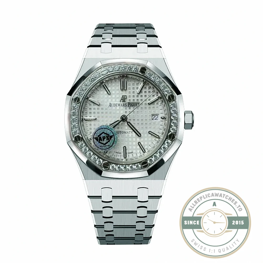 Leather-strap Royal Oaks are rarer than their bracelet counterparts, which gives the 15451ST a less common presence on the wrist. The crocodile texture adds an organic element that contrasts with the industrial geometry of the octagonal case and hex screws. Gray dial, diamond bezel, and leather strap together create a watch that leans more toward dress territory than any steel-bracelet Royal Oak in the same size. The steel case keeps the weight manageable and the durability high, while the diamonds prevent the watch from reading as purely utilitarian. This replica Royal-Oak 15451ST 37mm is the pick for anyone who wants Royal Oak architecture delivered through an unexpectedly refined package.