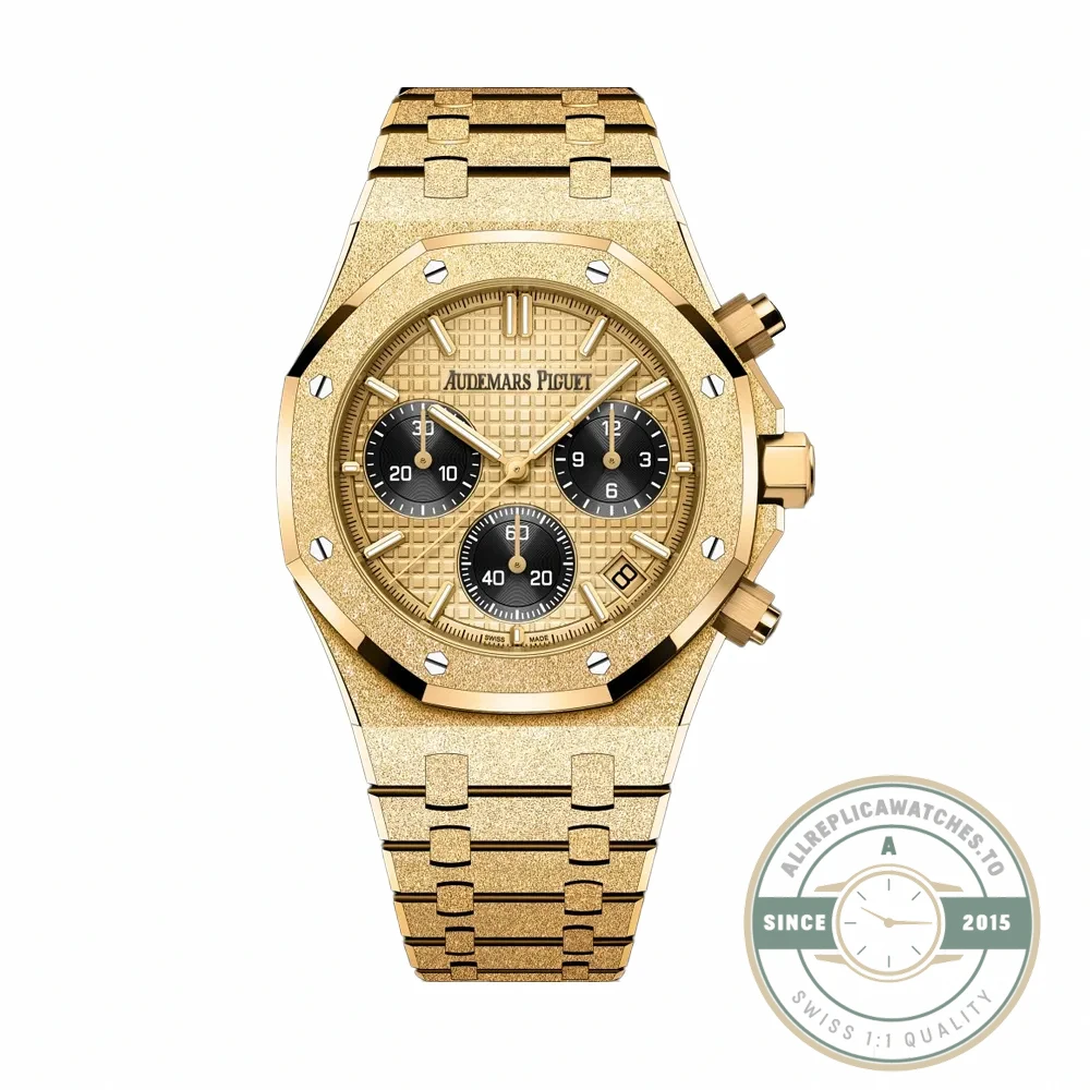 Within the 26240 family, yellow gold sits between the entry-level steel 26240ST and the platinum 26240PT. Each uses the same 41mm case geometry, but the material shifts everything from weight to light reflection. If you prefer gold-tone presence with chronograph functionality in the Royal Oak design language, this replica Royal Oak 26240BA delivers exactly that combination without compromise.
