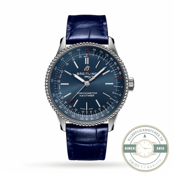 Sized at 35mm with a blue dial mounted behind a crocodile leather strap, this replica navitimer a17395161c blue reframes the Navitimer as a compact dress piece rather than a cockpit instrument. The A17395161C1P1 reference eliminates the slide rule bezel and chronograph complications, leaving a clean three-hand face with diamond hour markers and a date window at six. Breitling designed this variant to sit within the Navitimer 35 sub-range, which targets wrists that find the standard 41mm and 43mm cases too dominant for daily wear.