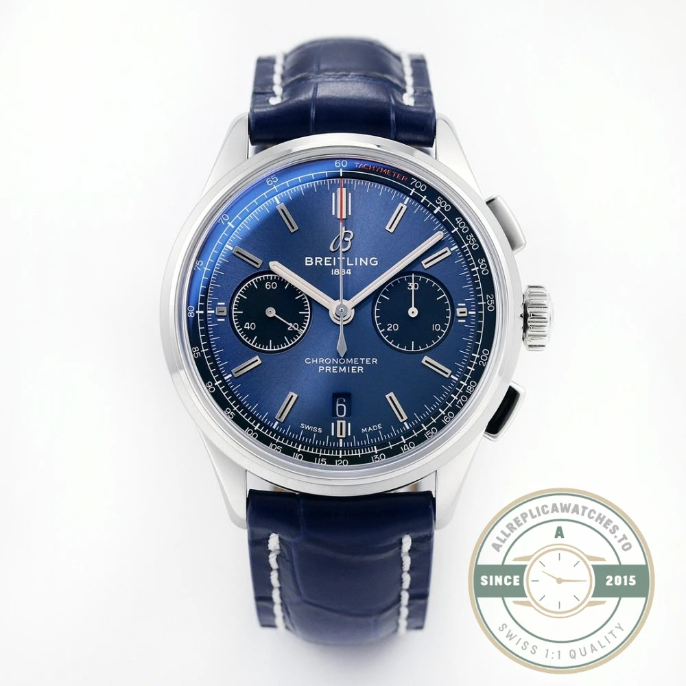Anchored by a blue sunburst dial, this replica premier ab0118221c blue sits inside a 42mm stainless steel case with a leather strap and represents one of several color options in the Premier B01 Chronograph 42 family. The AB0118221C1P1 reference uses the same case architecture as the black and grey variants but shifts the tone considerably through the blue dial finish. At 42mm the Premier chronograph avoids the oversized feel of sport-focused lines while providing enough real estate for three subdials and a date window. The crocodile-embossed leather strap adds a formal texture that complements the blue surface.