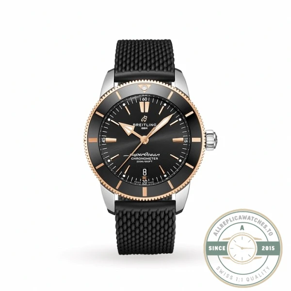 The rubber strap makes this Heritage reference lighter on wrist than bracelet-equipped alternatives despite the gold bezel adding marginal mass to the overall equation. On wrist, the red gold catches ambient light along the bezel edge while the black dial and matching rubber strap maintain a dark, restrained palette. This replica superocean ub2030121b black puts vintage dive heritage in a two-tone frame that handles both casual weekends and semi-formal settings without looking misplaced.