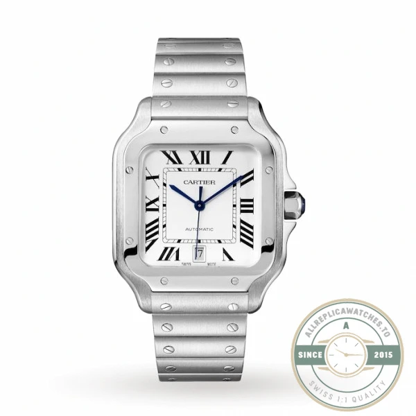 This replica Santos SSA0010 silver presents the Cartier Santos in its most recognizable configuration: stainless steel case, silver dial, and the signature square bezel with visible screws. The WSSA0010 reference carries forward the design Alberto Santos-Dumont wore on his wrist over a century ago, updated with modern proportions and a quick-release bracelet system. Roman numerals in black print sit against the silver sunray surface, framed by a minute track that runs inside the chapter ring. The overall impression is architectural, with straight edges and deliberate geometry replacing the curves found on most dress watches.