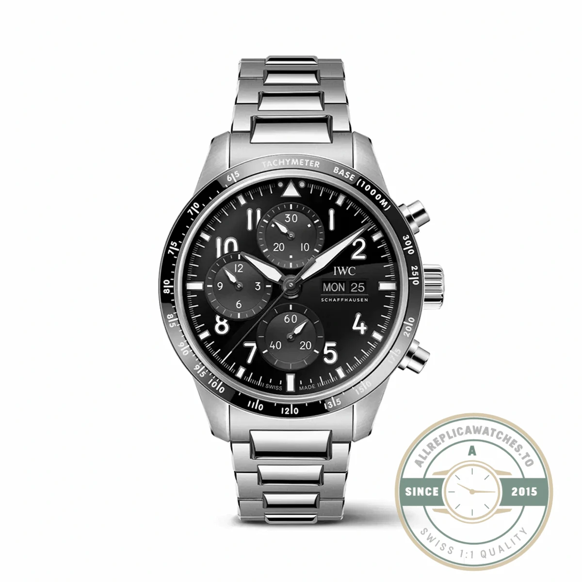Comparing the IW388304 to the IW388307 within the same 41mm platform highlights how dial tone changes the entire character of a watch. The lighter IW388307 reads as casual and open; the darker IW388304 reads as tool-like and focused. Movement, case dimensions, and water resistance remain identical between the two, so the choice is purely visual. For wearers who rotate between dark and light dials seasonally, both references complement each other. This replica Pilots IW388304 41mm delivers the darker interpretation of the 41mm chronograph platform.
