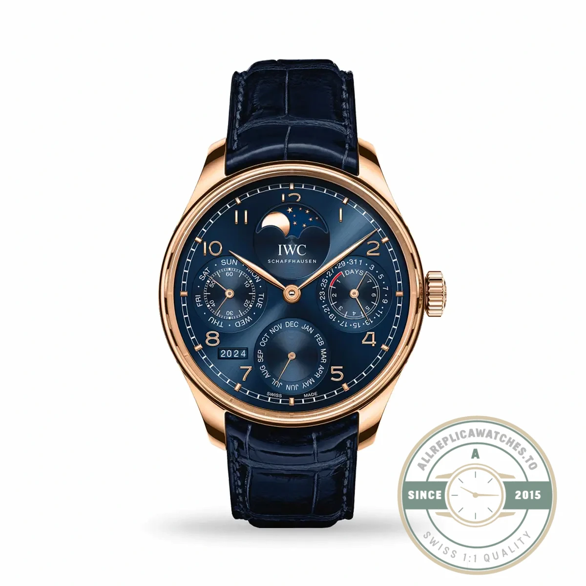 This replica Portuguese IW503312 is a boutique-exclusive perpetual calendar sized at 44mm, making it one of the larger and more visually commanding entries in the Portugieser range. IWC released the IW503312 through its own retail channels with a deep blue dial that separates it from the standard catalog perpetual calendars. The 44mm case gives each of the four calendar subdials enough space to remain individually legible, solving a readability challenge that smaller perpetual calendars often struggle with.