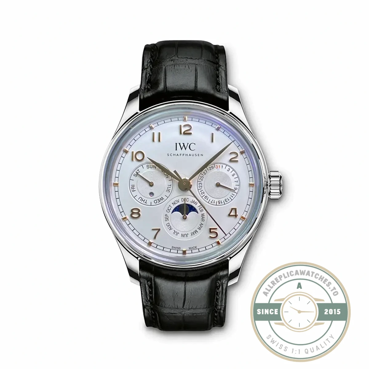 Among iwc portugieser perpetual calendar configurations, the IW344203 stands apart for combining the full calendar suite in a 42mm case rather than the larger 44mm format. That two-millimeter reduction changes the wrist presence significantly, making it viable as a daily dress watch rather than strictly a statement piece. The silver dial version reads more formally than blue or slate alternatives in the same family. This replica Portuguese IW344203 silver dial delivers the complete perpetual calendar experience in the most wearable diameter the line offers.