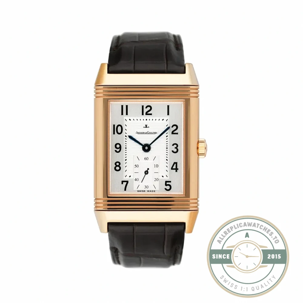 The square dial inside a 47mm rectangular case creates a visual rhythm that feels different from standard Reverso models at the same size. It reads as more geometric, more deliberate. This replica reverso gold 47mm serves the collector who wants rose gold presence with a dial layout that does not simply repeat the conventional format found across the rest of the Tribute lineup.