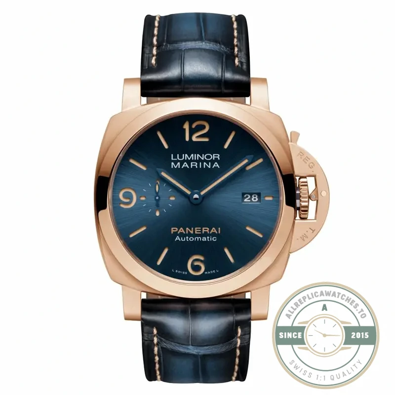 This replica luminor 1114 gold uses Goldtech, an alloy mixing copper into the gold composition to produce a warmer tone that resists oxidation better than standard rose gold. The PAM 1114 belongs to the Luminor Marina family and runs at 44mm with the signature crown-protecting bridge that defines every Luminor case. The blue sunburst dial pairs directly with the warm Goldtech case and matching gold-tone hands, creating a contrast that neither a steel version nor a standard gold version can deliver. Panerai positions this reference as the precious-metal entry point for the Marina line.