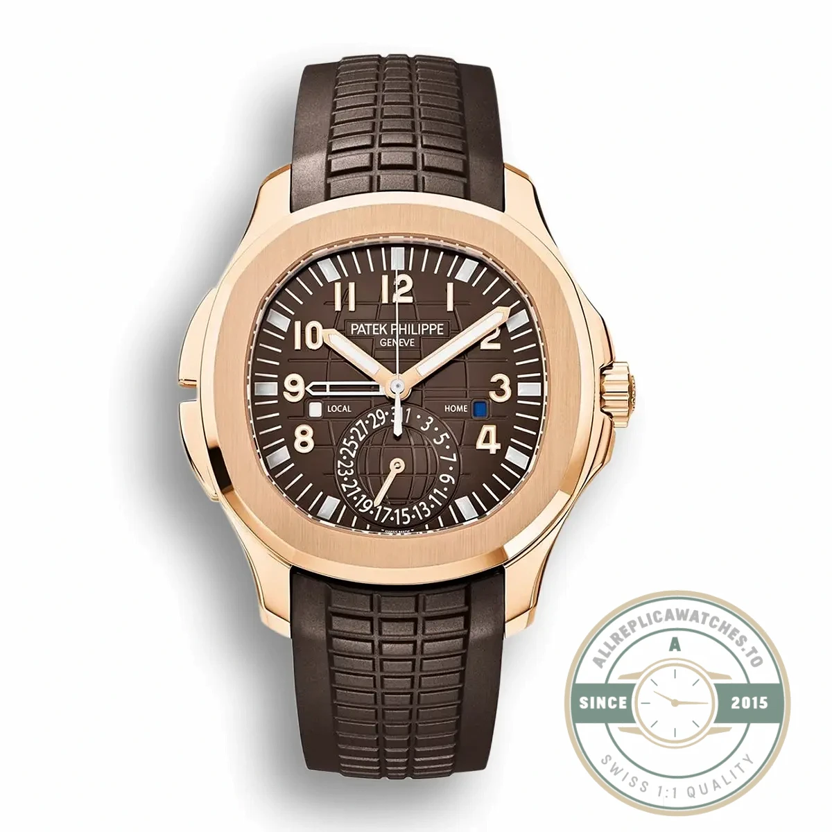 This replica aquanaut 5164R0 gold adds Travel Time dual-timezone functionality to the Aquanaut platform in a 40.8mm rose gold case. The 5164R-001 is one of the more practical complications in the Patek Philippe sport lineup, featuring a second hour hand in a contrasting color that tracks home time while you adjust the main hands for your current location. The gold case paired with a brown tropical composite strap gives this reference a warm, tonal appearance that separates it from the more utilitarian steel versions. At 40.8mm, it maintains the same case proportions as the standard 5167 while housing the additional Travel Time mechanism.