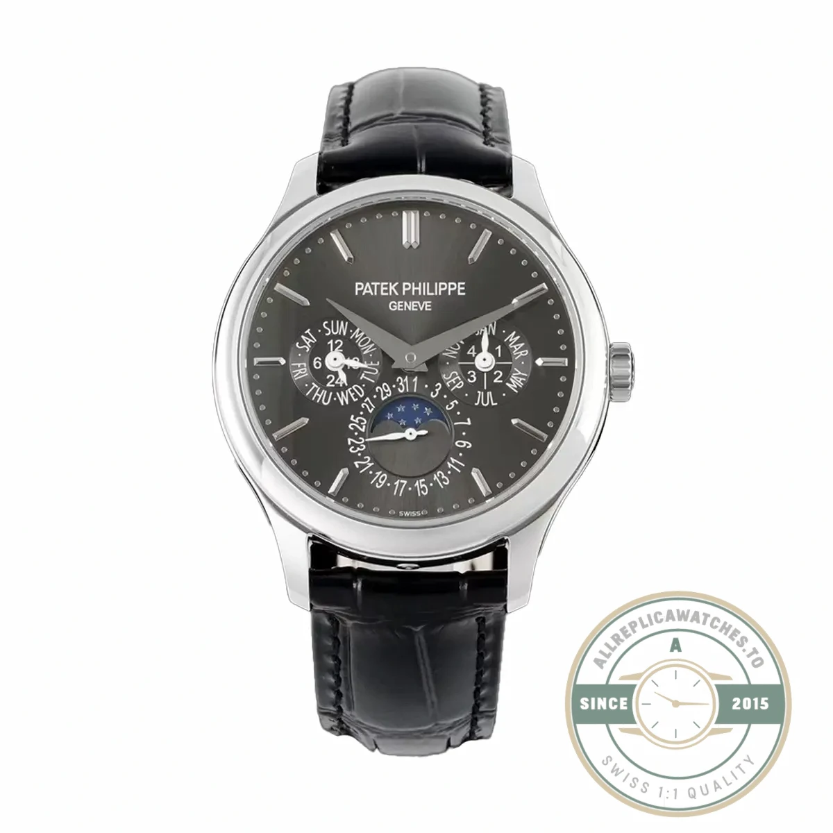 The replica complications 5327 / 5140 series white 40mm brings a grey dial variant to the celebrated 5140 perpetual calendar series. The Patek Philippe 5327 / 5140 series in white gold with a grey dial occupies a distinctive niche — neither as stark as a silver dial nor as bold as a blue one. It exists in a tonal middle ground that appeals to collectors who value subtlety above all else.