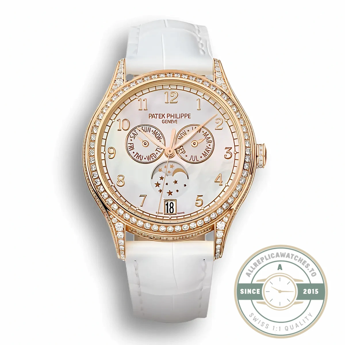 At 38mm, this replica complications 4948R0 gold brings the annual calendar and moon phase combination into a ladies’ format with diamond-set bezel and lugs. The Patek Philippe 4948R-001 uses rose gold throughout, paired with a gold-toned dial that matches the warmth of the case metal. Where most complicated watches in the catalog target men, the 4948R was designed from the ground up for smaller wrists without sacrificing mechanical sophistication.