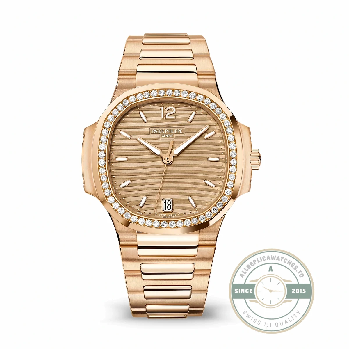 Built on the 7118/1200R-010 reference, this replica nautilus 711812 gold features a 35.2mm rose gold case with a golden sunburst dial that matches the warmth of the case metal. The golden dial reflects light across its horizontal embossing in a way that creates continuous movement on the surface, shifting between pale gold and deep amber as angles change. Patek Philippe designed the 7118 ladies Nautilus as a full automatic platform, not a quartz afterthought, and this rose gold version represents the most harmonious metal-to-dial pairing in the lineup.