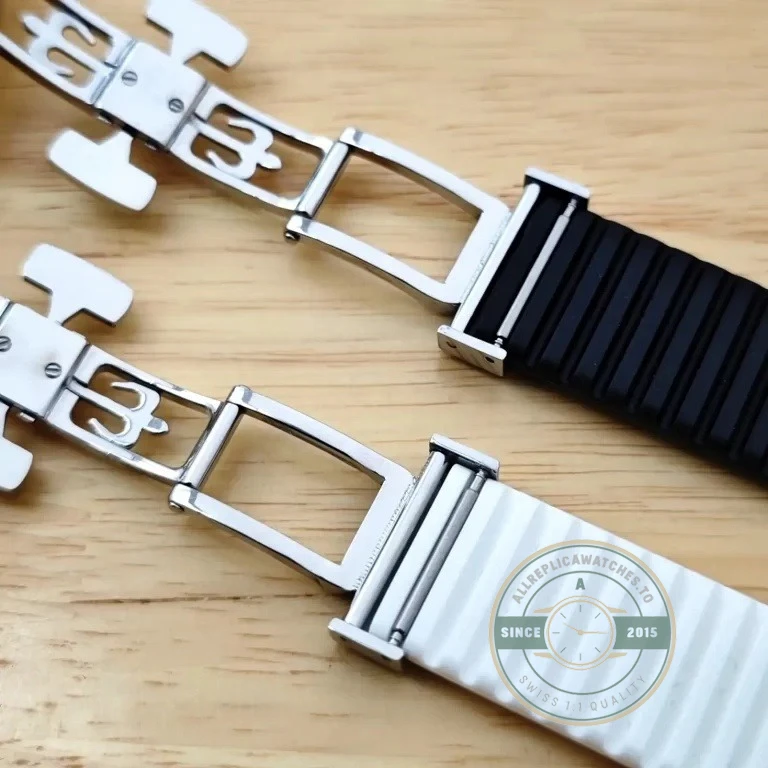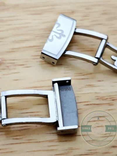 The Aquanaut folding buckle differs from the dress watch deployment buckle in several measurable ways. The clasp body is narrower to match the tapered rubber strap profile, and the fold mechanism uses a shorter throw to accommodate the reduced strap flexibility. Rubber composite straps do not develop the same wear patterns as leather, so the buckle geometry prioritizes secure closure over leather preservation. The mixed polished-and-brushed finishing on this buckle mirrors the case finishing on Aquanaut references like the 5167A. This replica nautilus 69395 provides that Aquanaut-specific folding buckle for collectors maintaining or upgrading their composite strap setup.