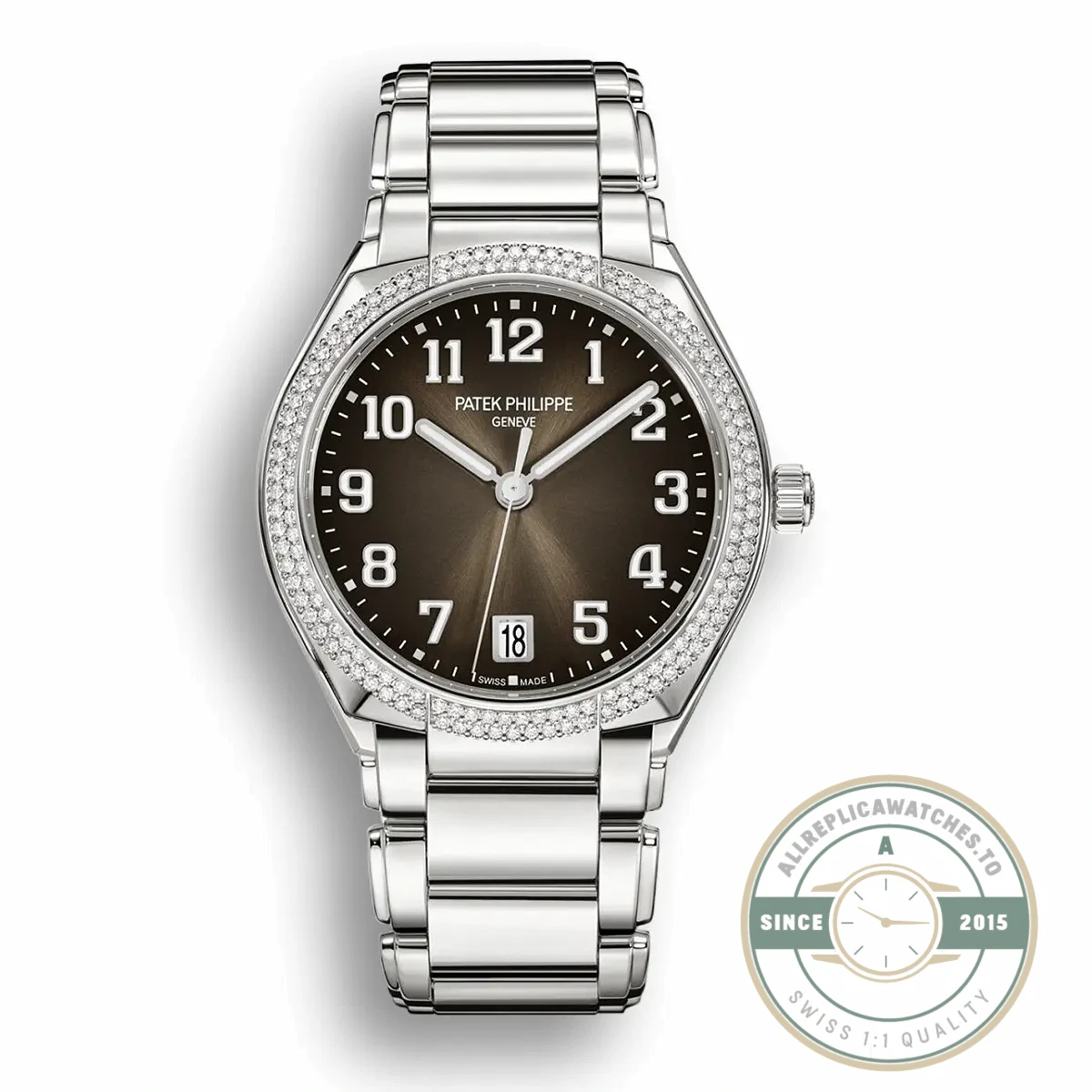 This replica twenty-4 730012 36mm brings the round automatic format that Patek Philippe introduced to the Twenty~4 line in 2018, moving the collection beyond its original rectangular quartz roots. The 7300-1200A reference sits at 36mm in stainless steel, a size that balances presence with proportion on most wrist sizes. Unlike the smaller 30mm rectangular pieces, this round case houses the caliber 324 SC automatic movement, giving it a mechanical heart that matches the rest of the brand’s sport-luxury range. The sunburst dial pattern catches light differently at every angle, shifting between silver and warm grey depending on the environment.