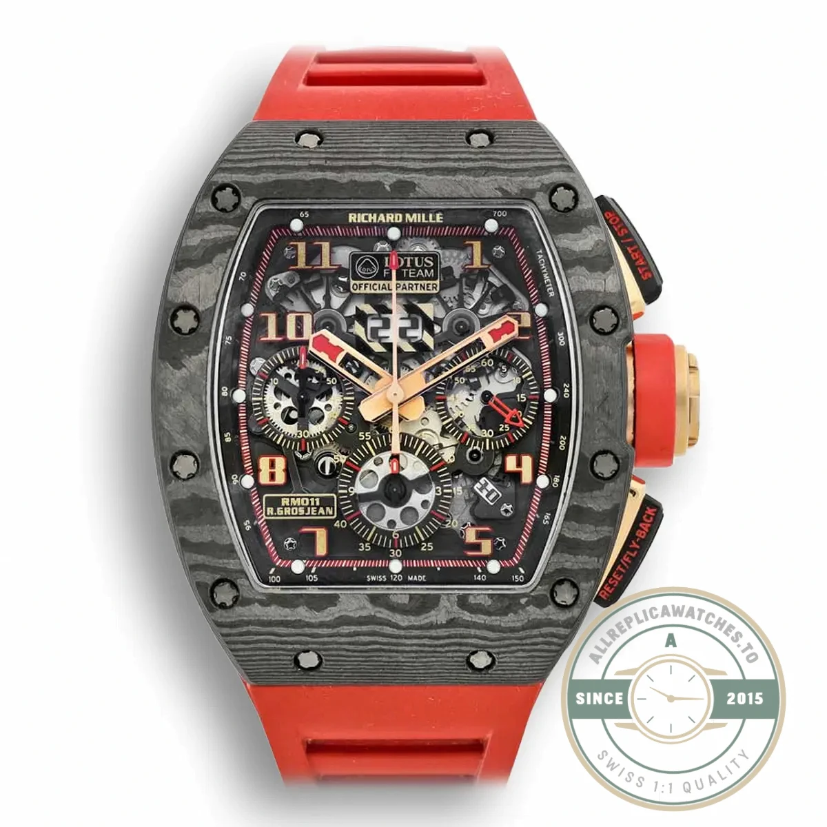Forged carbon casing with a red rubber strap makes this replica rm-011 red strap one of the most visually aggressive entries in the RM 011 range. The forged carbon process creates a marbled pattern where no two watches look exactly identical, giving each piece a unique texture across the bezel and flanks. Paired with the ETA 7750 chronograph movement, this version takes the flyback platform into lightweight, motorsport-inspired territory.