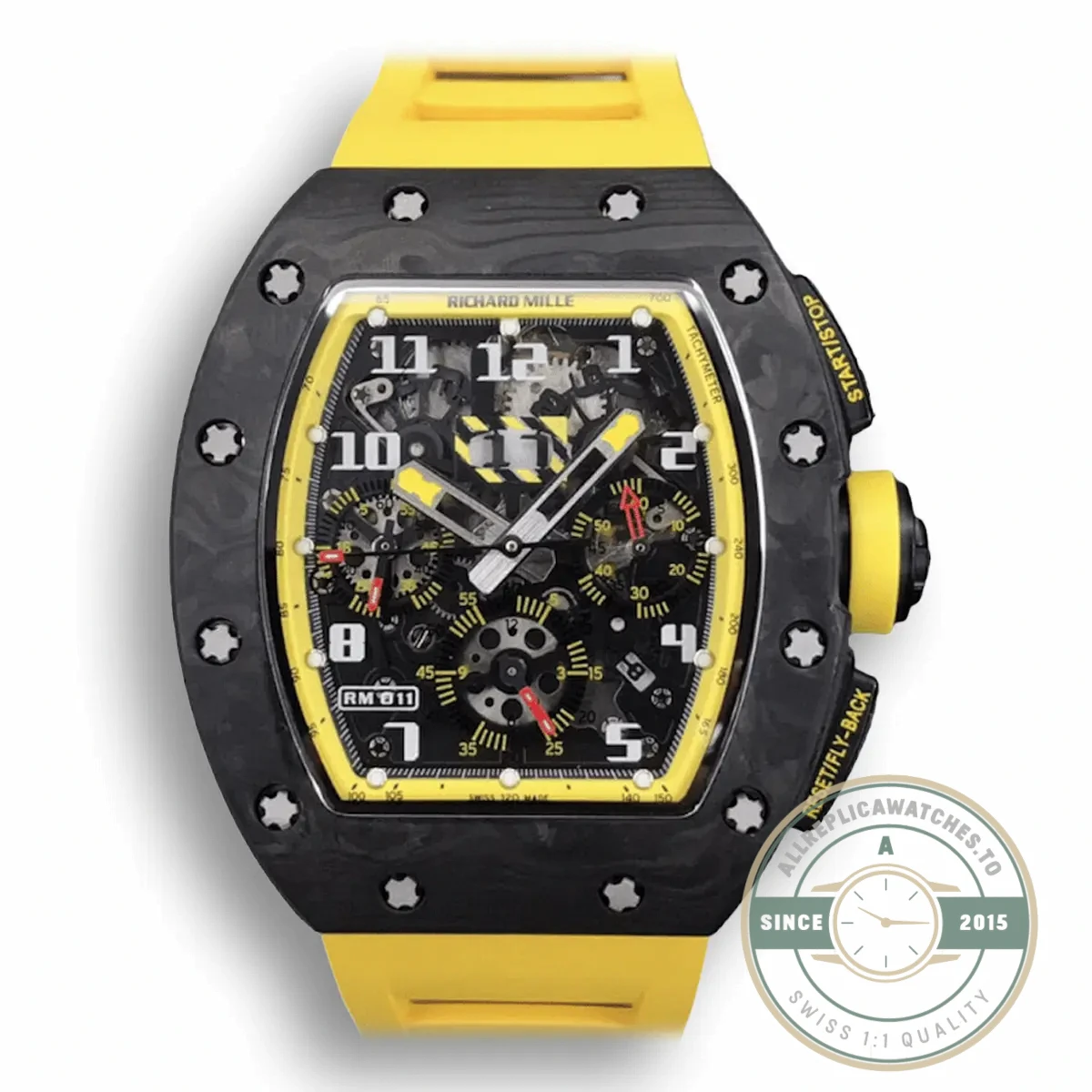 Yellow rubber against the RM tonneau case makes this replica rm-011 yellow one of the boldest entries in the 011 chronograph range. The color is not a subtle accent. It saturates the entire strap surface and creates a hard visual boundary between band and case that draws the eye immediately. At roughly 50mm across, the RM 011 already commands wrist presence through sheer dimensions and its barrel-curved profile. Adding a yellow strap to that foundation produces a watch that functions as both a timekeeping instrument and a statement piece with zero ambiguity about intent.