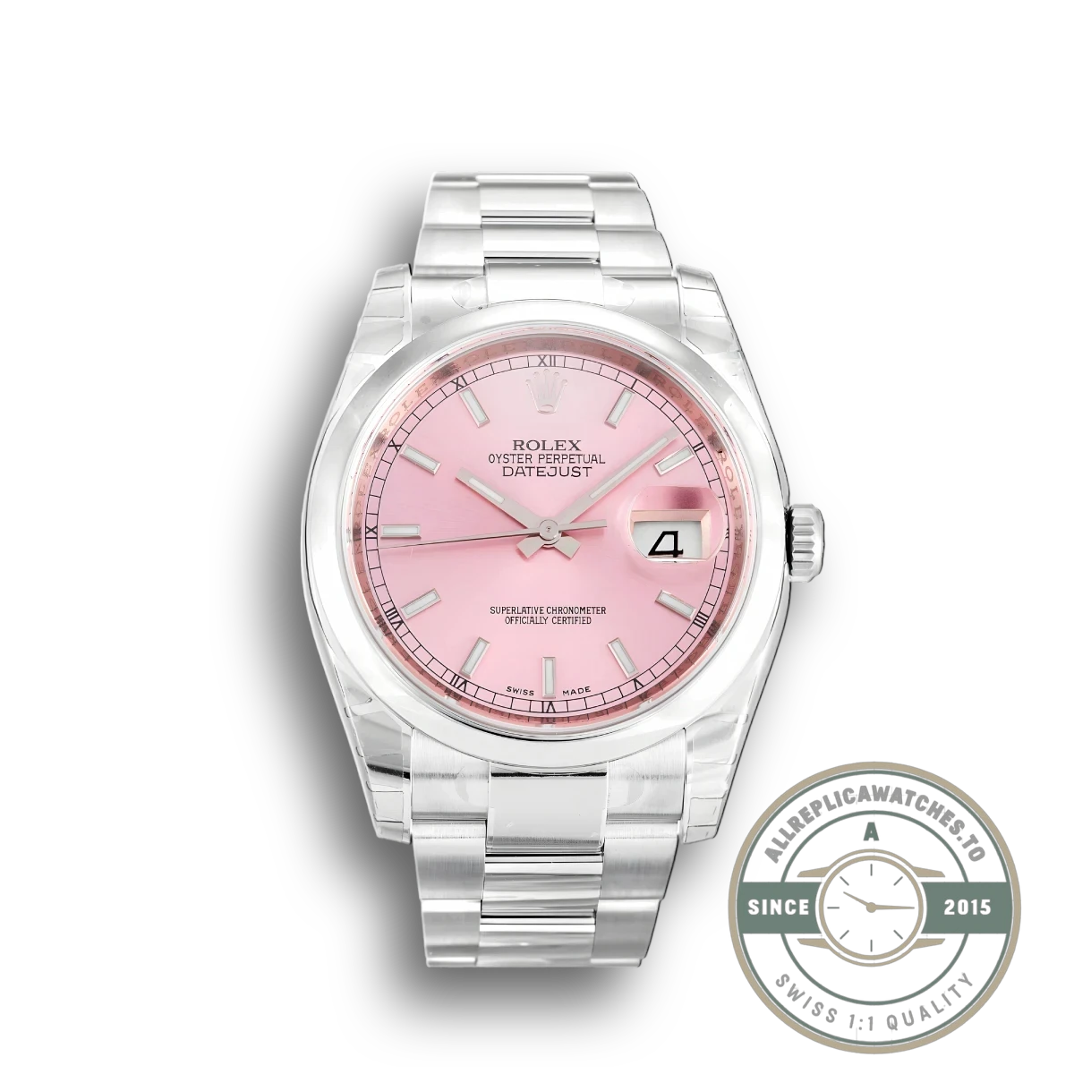 Pink dials tend to age well visually because the color sits between warm and neutral, avoiding the trend-dependent feel of bolder hues. The 116200 reference keeps things simple with no precious metal, no diamond markers, and no complications beyond the date. For anyone evaluating a datejust 36 replica in a non-standard colorway, this replica Datejust 116200 pink delivers personality without excess.