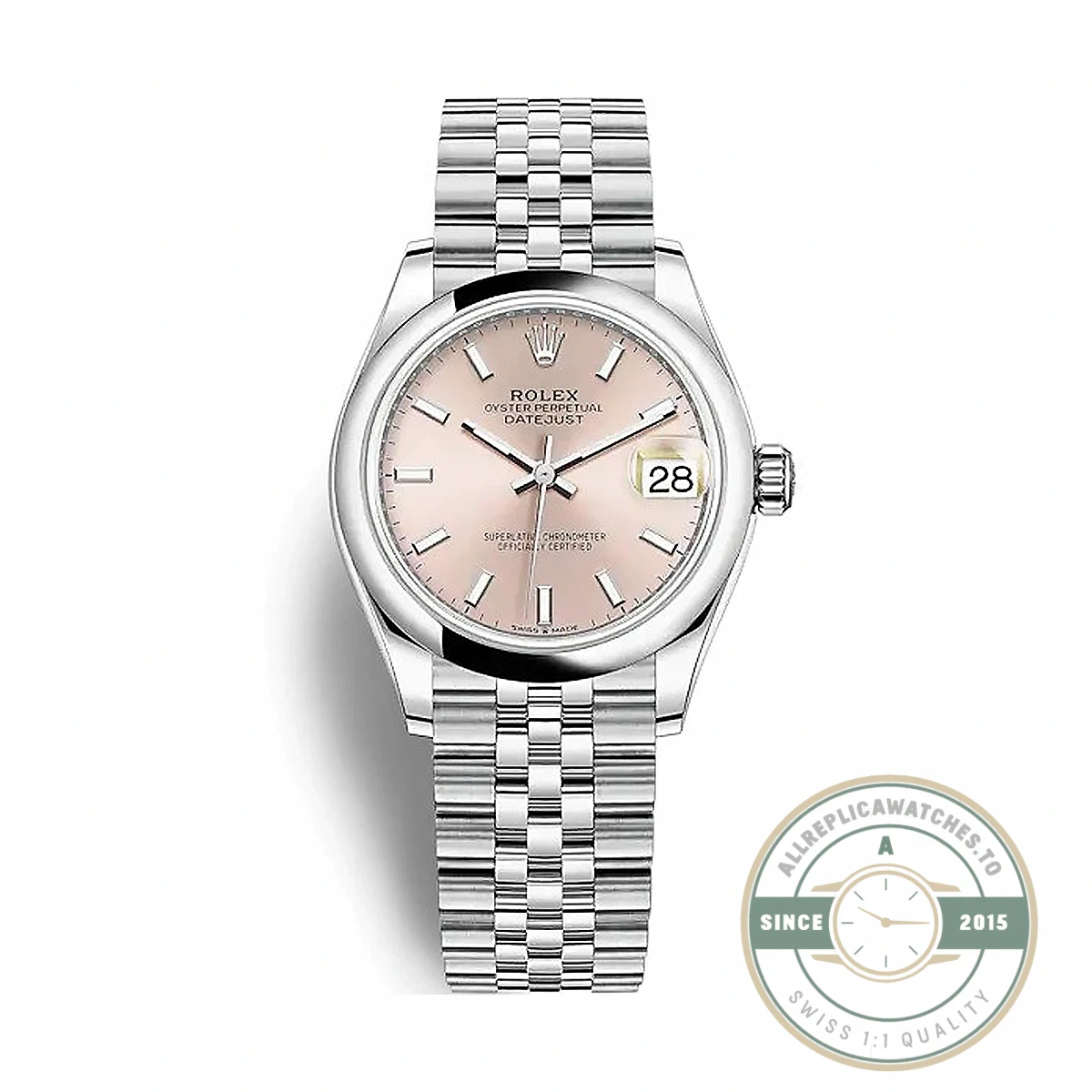 Pink dials on the Datejust have historically attracted buyers looking for something subtler than blue or green but more interesting than white. The stick indices on this 278240 create a balanced, symmetrical dial layout that avoids the visual weight of Roman or diamond-set alternatives. If you want to see how the datejust 31 replica range compares at a larger scale, the 126333 Wimbledon in 41mm represents the opposite end of the Datejust spectrum. Both are available within the broader Datejust lineup and share the same design DNA despite their size gap.