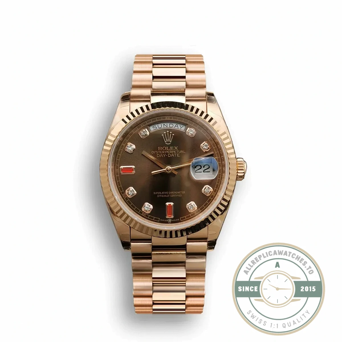 Chocolate dials tend to photograph darker than they appear on the wrist. In person, the dial reveals gradient qualities that flat images compress. This is a Day-Date that benefits from direct viewing, where the interaction between the warm dial surface and the surrounding yellow gold becomes fully apparent. Compared to the rose gold chocolate version, the yellow gold edition reads slightly brighter and more traditionally opulent. The 36mm case diameter keeps everything in proportion for a dress watch that sits cleanly under shirt cuffs. This replica Day-Date chocolate 36mm brings a warm, versatile personality to the presidential lineup.