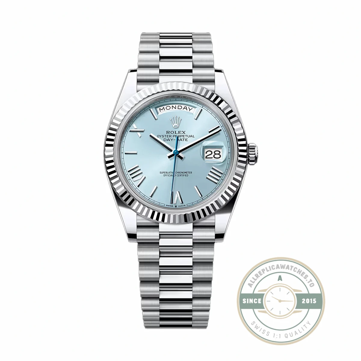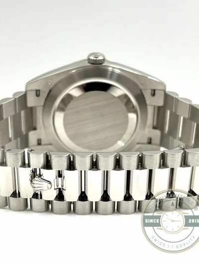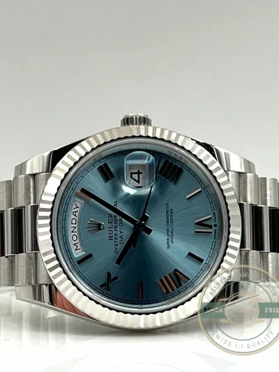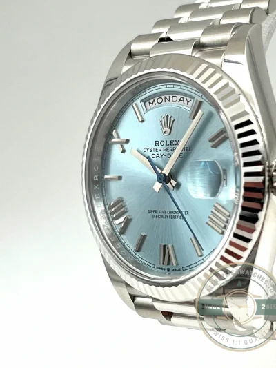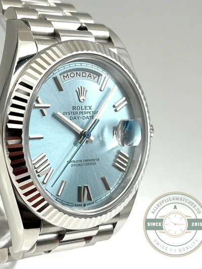 This replica Day-Date 228236-0012 puts the signature ice blue dial with Roman numeral hour markers against a 40mm platinum case, the most exclusive metal configuration in the Day-Date catalog. Ice blue remains reserved strictly for platinum references, making it an immediate identifier of the material. In this version, the use of applied Roman numerals introduces a more classical design language, giving the watch a traditional character while maintaining the cool, monochromatic aesthetic. The fluted bezel adds texture and contrast, reflecting light against the smooth dial surface and reinforcing the elevated positioning of this reference.