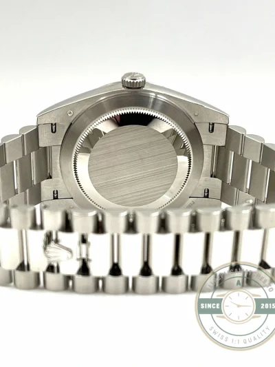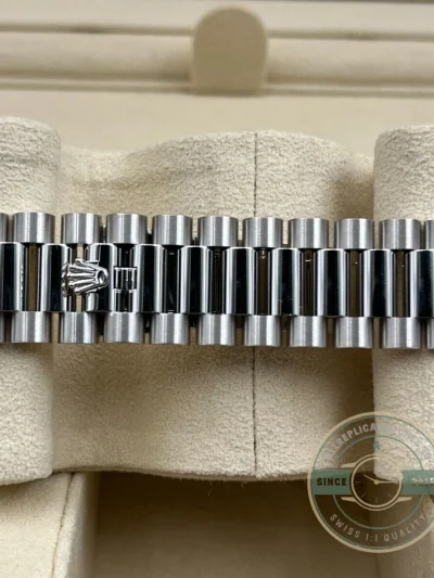 Platinum Day-Dates are defined as much by weight as by appearance, and the 228236-0012 delivers that full-density feel with a more traditional visual profile. The ice blue dial keeps the watch aligned with understated luxury, while the Roman numerals reinforce a timeless design approach. In varying light conditions, the dial shifts subtly between pale blue and silver tones, maintaining visibility without excessive contrast. This replica Day-Date 228236-0012 presents platinum in its most classic form, combining material exclusivity with a dial layout rooted in traditional watchmaking design.