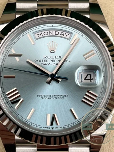 Ice blue dials on platinum create a tonal harmony unique to the Day-Date line. The Roman numeral markers emphasize symmetry and heritage styling, offering a more understated alternative to diamond-set or baton marker configurations. The fluted bezel amplifies ambient light, creating contrast with the cooler, more restrained dial surface. This combination results in a watch that balances legibility with classic aesthetics. The Day-Date collection places platinum at the top of its material spectrum. For broader comparison, the platinum 40mm collection overview demonstrates how different dial executions alter the same core reference.