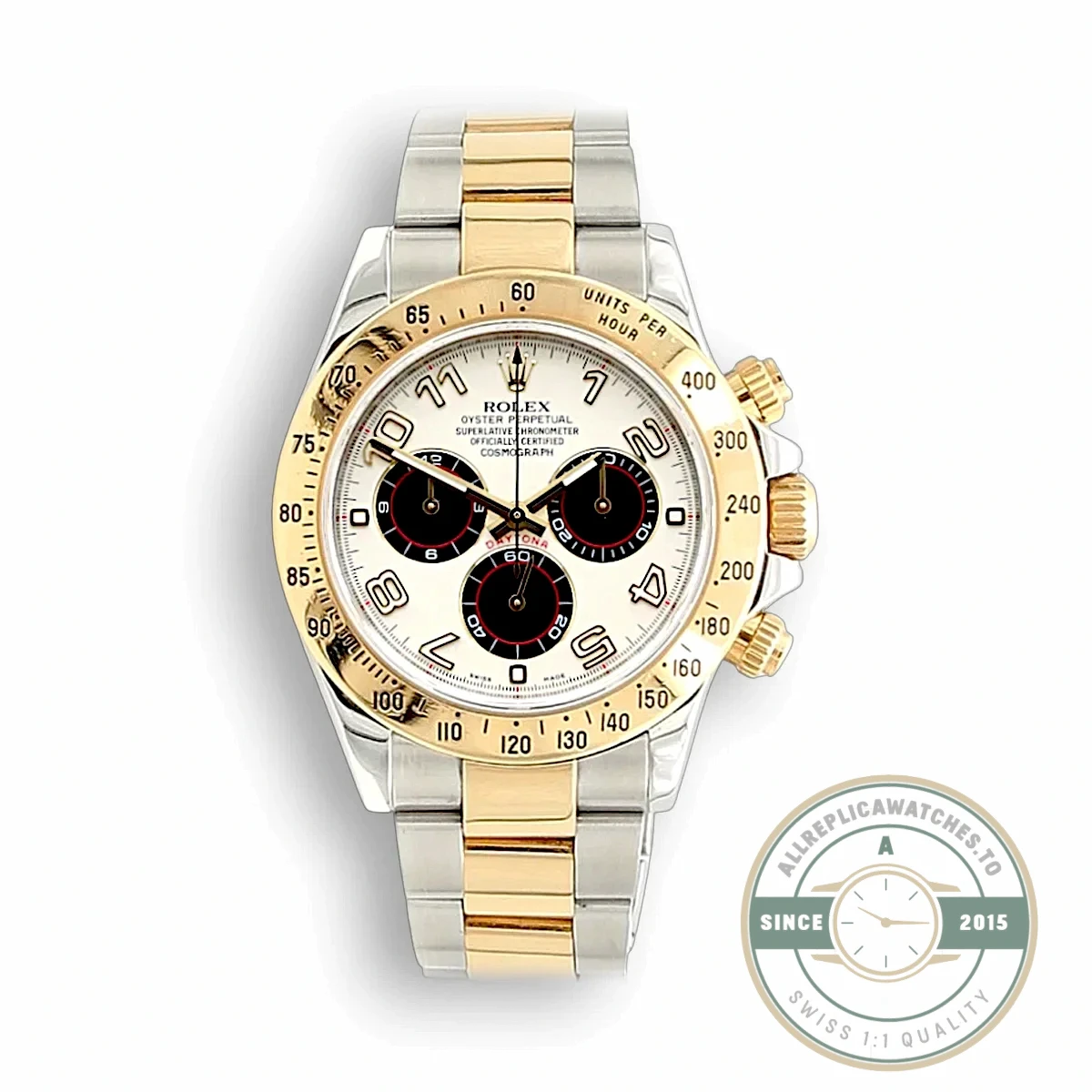 This replica Daytona 116523 pairs Oystersteel with yellow gold plating in a classic two-tone combination that has defined the Cosmograph since the late 1980s. The 116523 belongs to the previous-generation Daytona family, running on an automatic chronograph caliber inside a 40mm case with screw-down pushers rated to 30 meters. White dial, three contrasting sub-registers, and a tachymetric bezel engraved directly into the gold surround give this version a dressier edge compared to the all-steel references. The Oyster bracelet alternates polished gold center links with brushed steel outer links, creating a visual rhythm you notice immediately on the wrist.