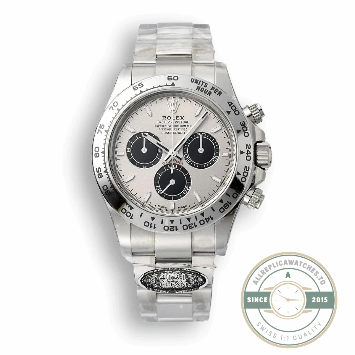 Reference M126509-0003 introduces white gold to the Cosmograph Daytona in a configuration that pairs the precious metal with a silver dial and matching Oyster bracelet. This replica Daytona M126509 measures 40mm across and uses a fixed bezel with engraved tachymetric scale in 18k white gold. Unlike yellow or rose gold variants, white gold reads closer to steel at a glance but carries the density and finishing of a precious metal case.