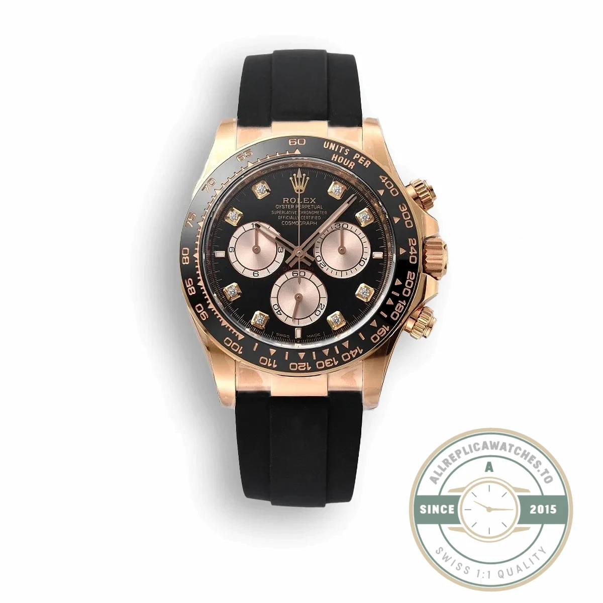 Replica Daytona M126515ln Cosmograph reference 126515LN-0004 adds diamond markers to the dark dial, layering gemstone accents onto the rose gold and Oysterflex formula. The 40mm case maintains the standard Cosmograph dimensions while the bright black dial surface creates a neutral backdrop for the gem-set hour markers. This is a spec upgrade over the standard 126515LN, targeting collectors who want something beyond a straightforward luminous dial.