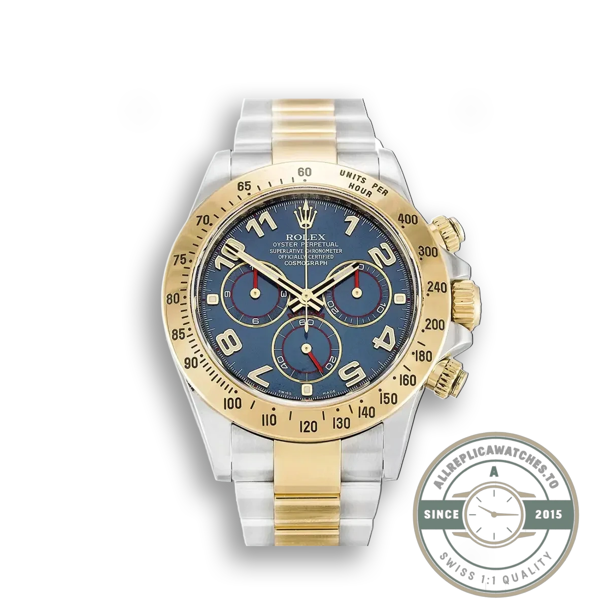 Two-tone Daytonas in black or white show up frequently. The blue dial version does not, which makes it an immediate conversation piece without relying on diamonds, exotic materials, or unusual case metals. The yellow gold elements complement the blue surface without overwhelming it, and the Oyster bracelet in mixed metal grounds the overall impression. This replica Daytona 116523 blue is a two-tone Cosmograph that stands out through dial color rather than sheer material value.