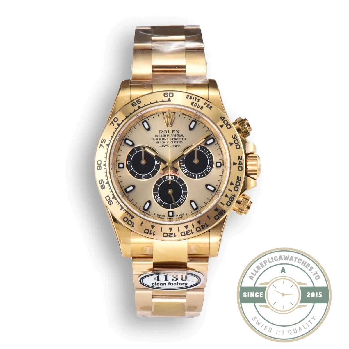 The gold Cosmograph Daytona holds a particular place in Rolex’s chronograph history, and this replica Daytona m116508 in full yellow gold with a matching Oyster bracelet captures that presence at 40mm. Reference 116508 is the all-gold Daytona on a metal bracelet, a configuration that has appeared across several dial variations since its introduction. This version features a gold-tone dial with chronograph registers, sapphire crystal, and water resistance rated to 30 meters.