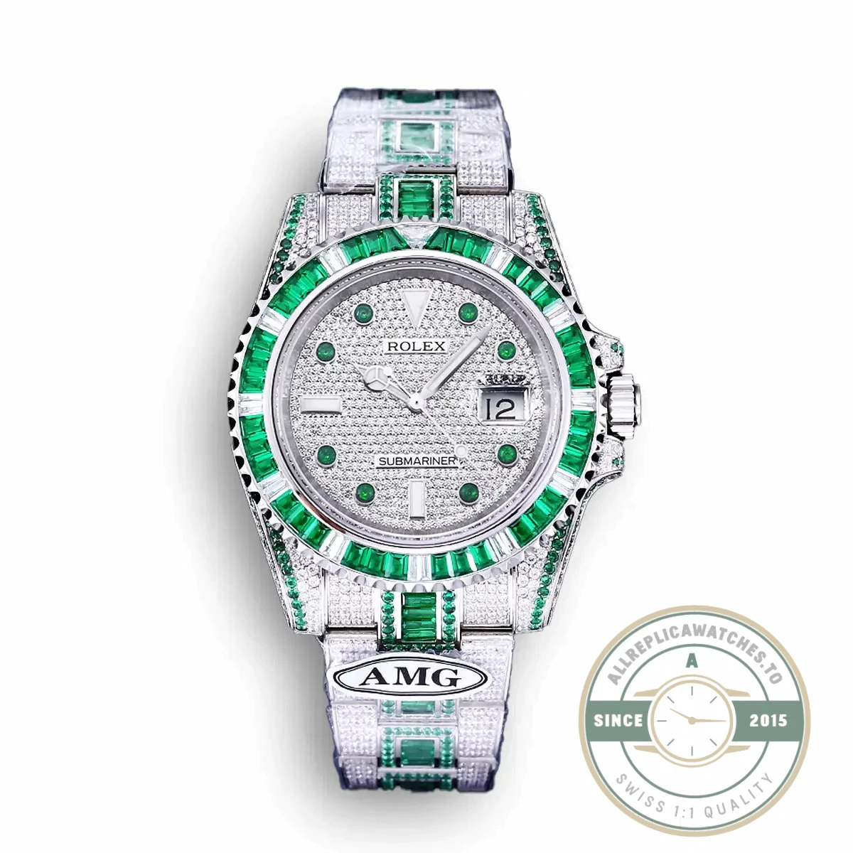 Custom color combinations on iced-out bezels are where individual personality enters the Submariner world. The green-and-white split is not something available from any factory standard configuration, making this a piece that stands outside the usual categories. It borrows the Submariner shape and mechanics but makes them serve a vision that is entirely about personal expression. For anyone looking beyond standard clear or black diamond options, this replica Submariner 63474 offers a color-blocked alternative that turns the bezel into the focal point of the entire watch.