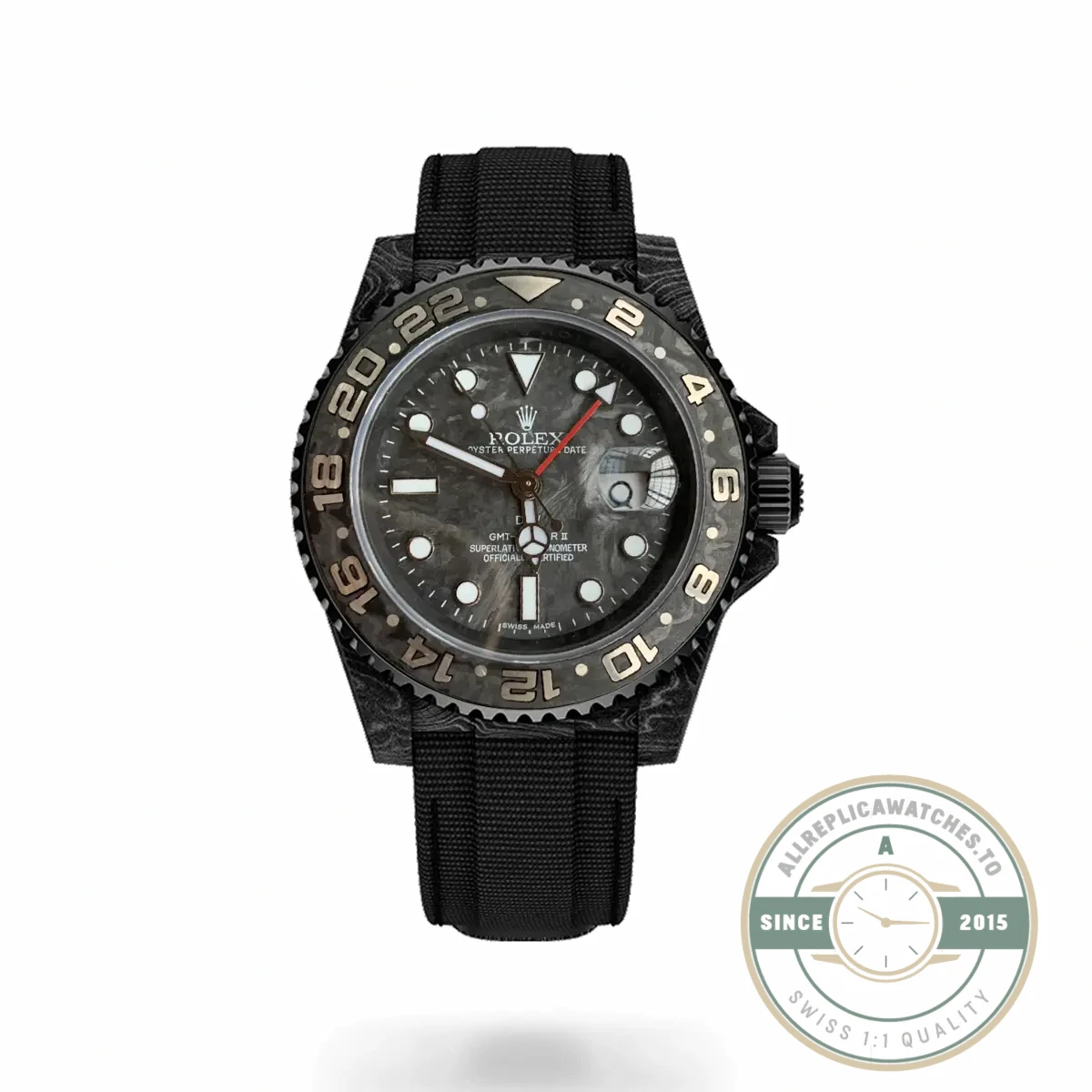 This replica GMT-Master carbon fiber edition strips every factory surface and replaces it with NTPT carbon, producing an all-carbon GMT-Master II that weighs a fraction of any steel reference in the catalog. NTPT (Thin Ply Technology) carbon layers hundreds of filaments at alternating 45-degree angles, creating the signature striped pattern visible across the case, bezel, and even the dial. At 40mm the case geometry follows the standard GMT-Master II profile, but the material swap transforms the watch from a conventional tool piece into something closer to a motorsport instrument.
