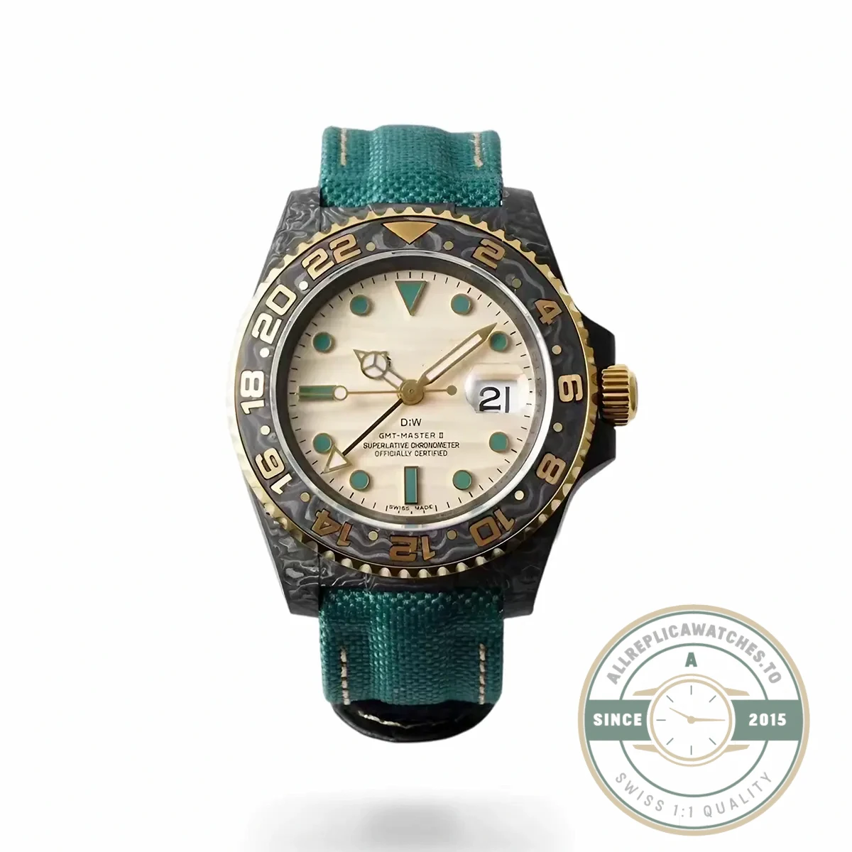 This replica GMT-Master carbon yellow edition takes the 40mm GMT-Master II platform into custom territory with a carbon fiber case and a grey dial accented by yellow details. The combination sits outside the standard Rolex catalog entirely, drawing from aftermarket builders like DiW who strip factory steel and replace it with forged or woven carbon composites. The result is a GMT-Master that weighs noticeably less than any steel reference while standing out visually from every production bezel color in the lineup.