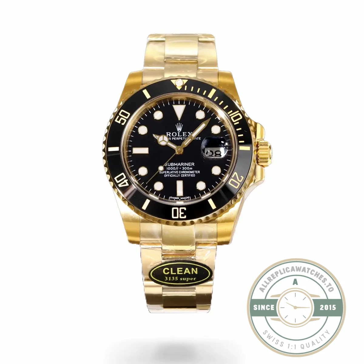 Most Submariners sold are stainless steel. The all-gold 116618LN occupies a fundamentally different position, serving buyers who want the Submariner silhouette delivered through precious metal from crown to clasp. The black dial and bezel temper the gold, keeping the watch rooted in the sport category rather than letting it drift into jewelry territory. On the wrist, the weight difference from a steel Submariner is unmistakable. This replica Submariner 116618LN black brings that full gold presence to anyone drawn to the heaviest-hitting variant in the lineup.